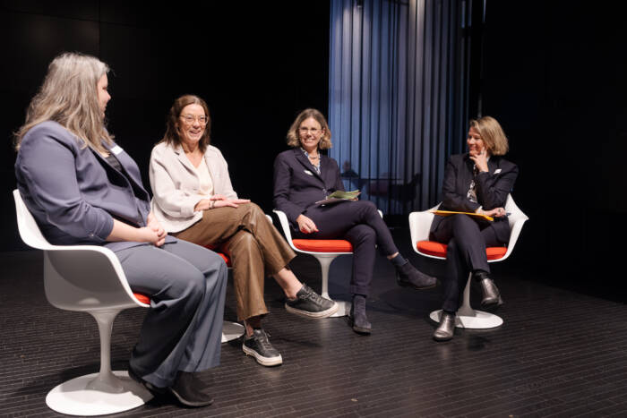 Prof. Dr Alice Delorme Benites, directrice de l’Institut de la communication plurilingue de la ZHAW ; Nathalie Wappler Hagen, directrice de la SRF ; Astrid Tomczak-Plewka, modératrice ; Ariane Dayer, journaliste et ancienne rédactrice en chef de Le Matin Dimanche.